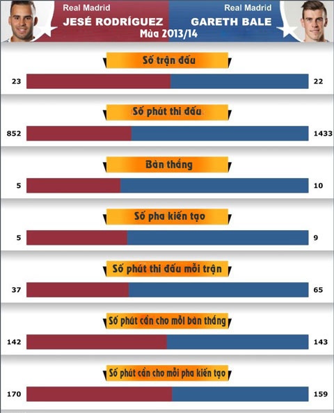 | Thống kê so sánh hiệu quả thi đấu của Jese và Bale. |