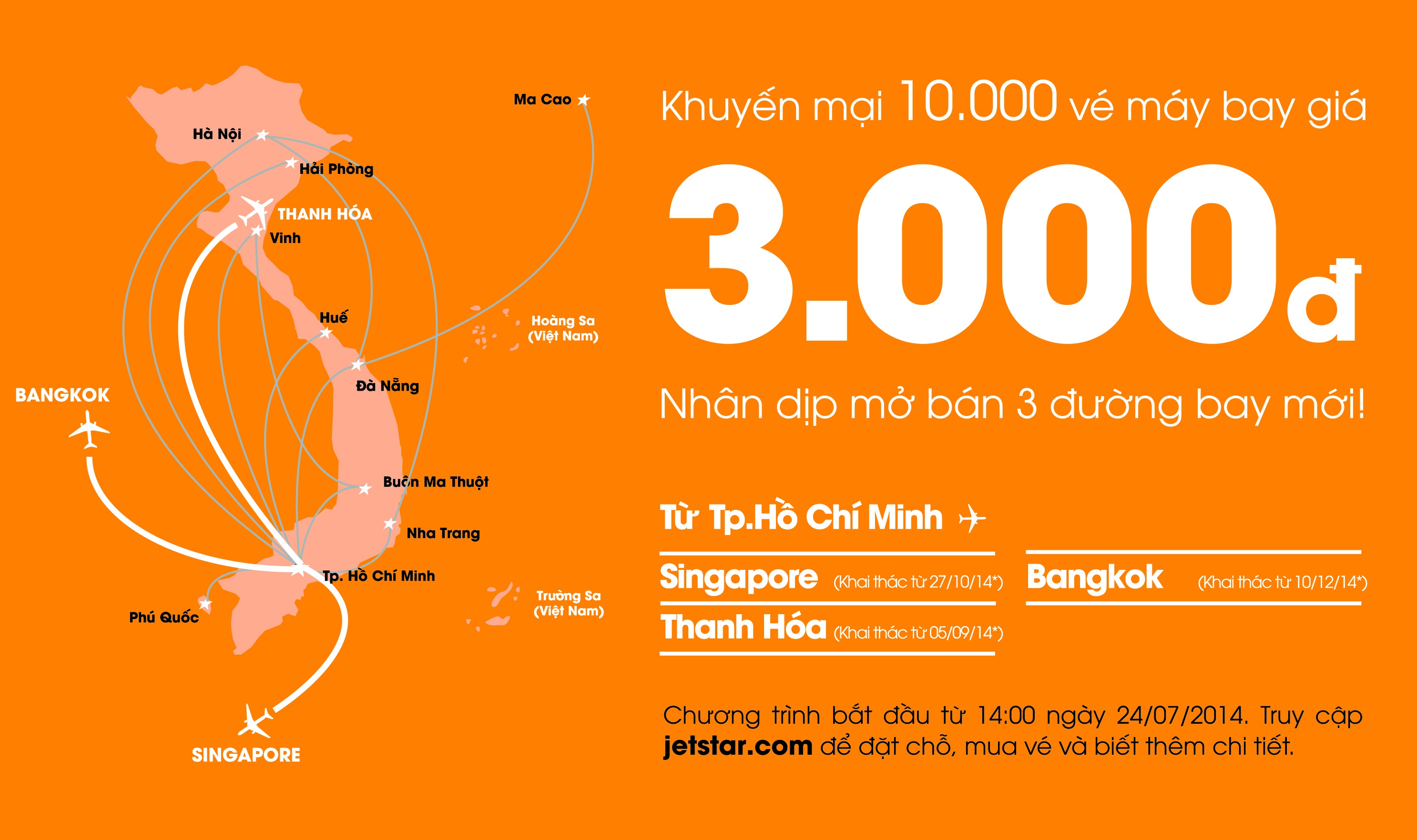Theo thông tin từ Jetstar Pacific, 10.000 vé máy bay giá 3.000 đồng được mở bán theo 3 đợt, đợt 1 từ 14h ngày 24/7, các đợt mở bán thứ 2 và thứ 3 diễn ra sau đó cho đến hết ngày 9/8. Song song với chương trình 10.000 vé giá 3000 đồng là nhiều chương trình khuyến mại giảm giá hấp dẫn không kém. Thông tin chi tiết có tại website www.jetstar.com hoặc gọi 19001550.