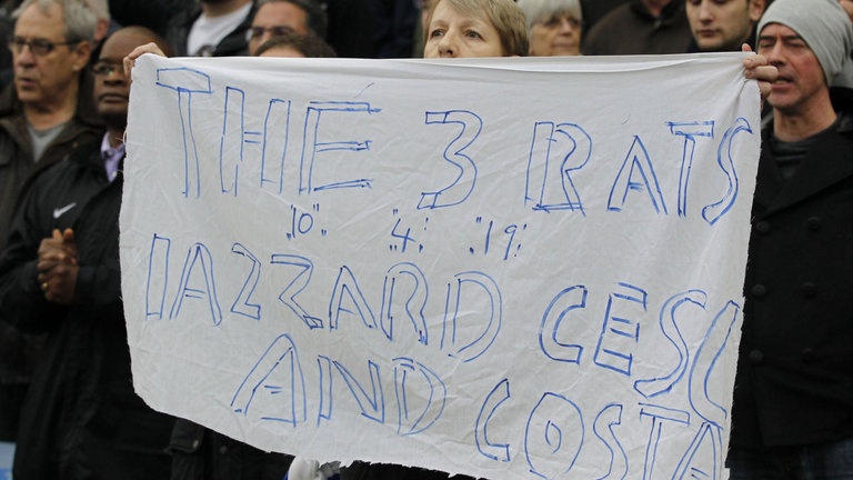 | Trên băng-rôn ghi: "Ba con chuột là Hazard, Cesc và Costa". |