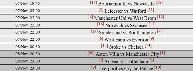 | Lịch thi đấu vòng 12 Ngoại hạng Anh diễn ra cuối tuần này. Chelsea làm khách trên sân của Stoke lúc 0h30 ngày 8/11. |