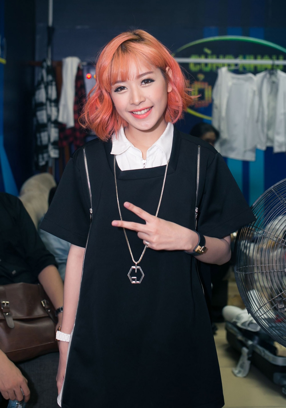 | Ca sĩ trẻ Phương Ly diện bộ đồ đen, ôm sát cơ thể. Cô nhận được sự cổ vũ của chị gái Phương Linh trong hậu trường. |