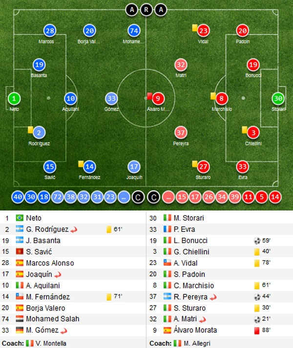 Ở phút cuối hiệp một, thủ thành Neto thi đấu xuất sắc trong tình huống cản cú sút của Morata, nhưng không thể ngăn cản Roberto Pereyra băng vào đệm bóng cận thành giúp Juve dẫn 2-0. Nếu trận lượt về khép lại với tỷ số này, "Lão phu nhân" sẽ giành quyền vào chung kết.