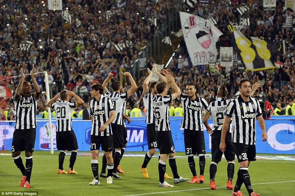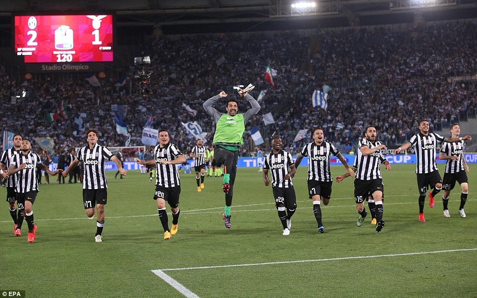 | Trên sân Olimpico, cầu thủ Juventus phấn khích sau khi hoàn tất cú đúp ở hai giải đấu trong nước. |