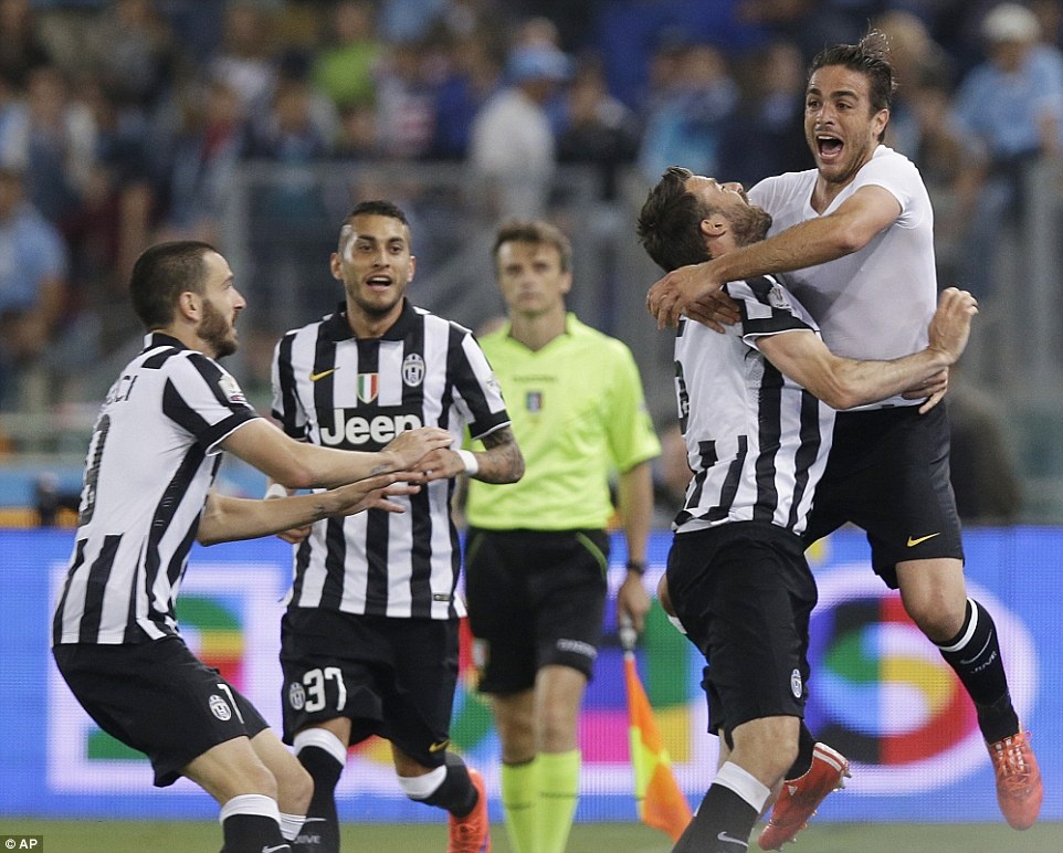| Cầu thủ Juventus vui mừng sau khi Alessandro Matri ghi bàn nâng tỷ số lên 2-1 ở hiệp phụ thứ nhất. |