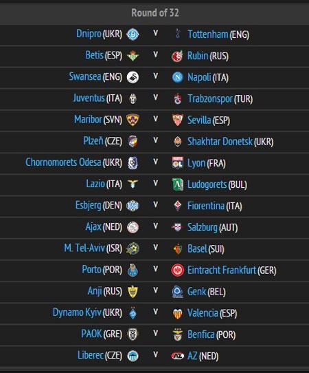 Tottenham, đội bóng vừa sa thải HLV Andre Villas-Boas cách đây ít giờ, sẽ đụng độ Dnipro Dnipropetrovsk. Ajax gặp Salzburg (Áo), còn Porto chạm trán Eintracht Frankfurt.