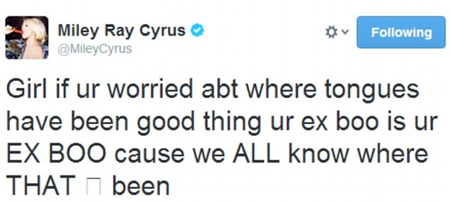 Lời chia sẻ nhạy cảm của Katy khiến Miley không hài lòng. Nữ ca sĩ trẻ đáp lại trên Twitter: "Cô gái, nếu cô lo lắng về chuyện những cái lưỡi đã từng chạm vào đâu thì thật may là bạn trai cũ của cô giờ chỉ là bạn trai cũ, bởi tất cả chúng ta điều biết cái lưỡi đấy đã từng chạm vào đâu".