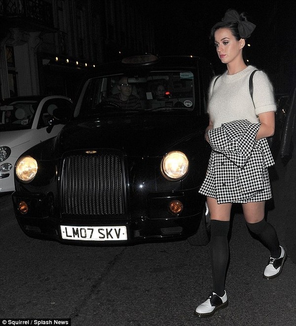 | Katy Perry diện trang phục như nữ sinh tại London tối thứ 6 vừa qua. |