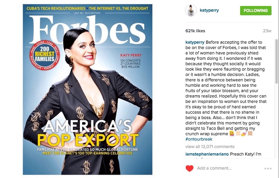Katy Perry đứng đầu danh sách Nghệ sĩ có thu nhập cao nhất 2015 với 135 triệu USD/năm. Giọng ca I Kissed A Girl chăm chỉ đi tour Prismatic World và thu về trung bình hơn 2 triệu USD mỗi thành phố đến trình diễn. Ngoài ra, số tiền đến từ các hợp đồng quảng cáo cho Claire’s, Coty, Covergirl và màn trình diễn trong đêm chung kết Super Bowl cũng đem về cho nữ ca sĩ khoản thu nhập không hề nhỏ.