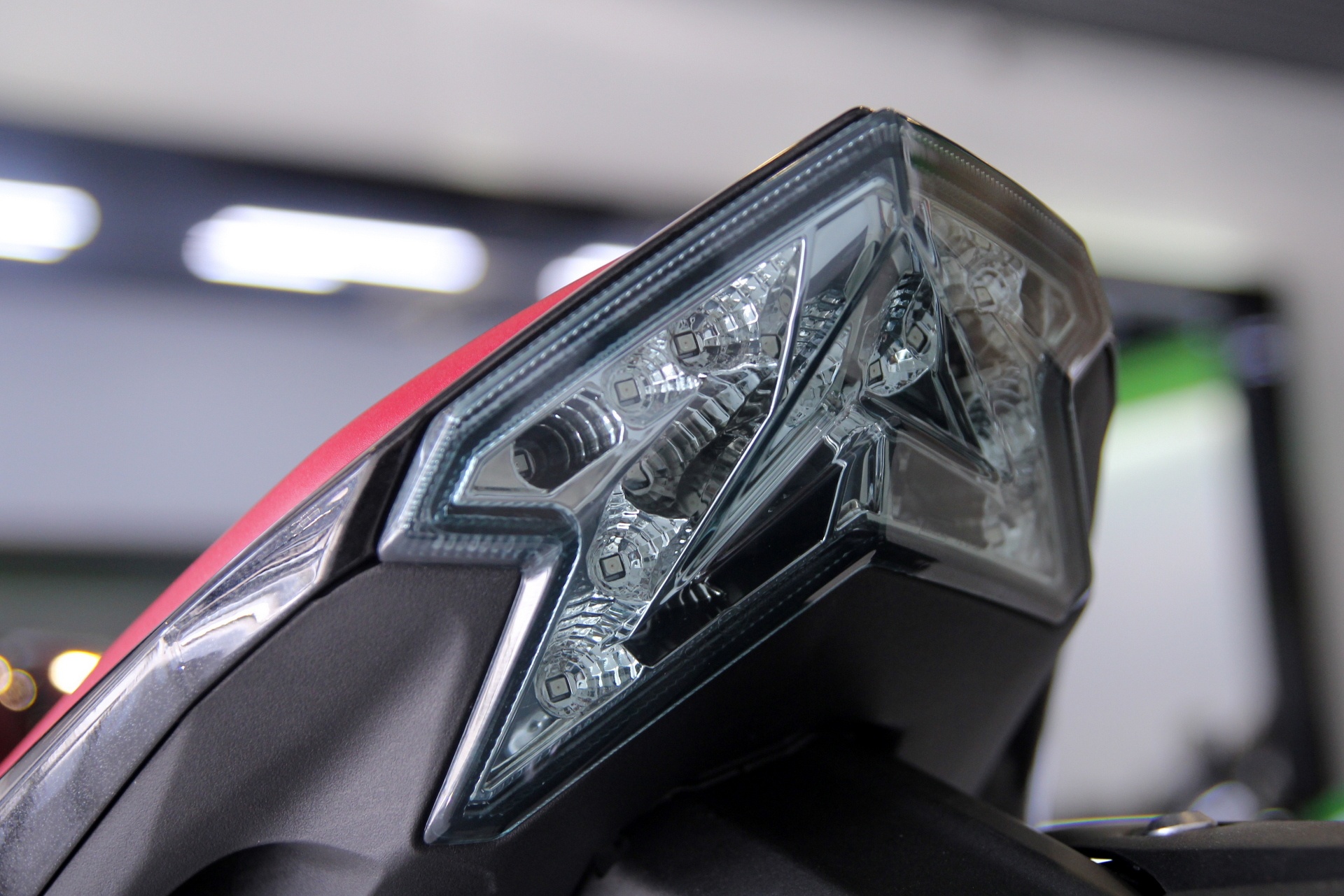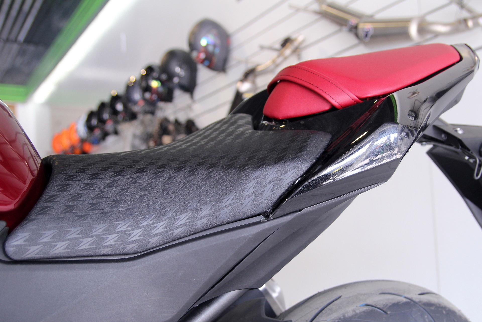 | Yên xe in chữ Z cách điệu trên da. Yên dành cho người ngồi sau màu đỏ. Chiều cao đến yên 834 mm, phù hợp với những người khoảng 1,7 m. |