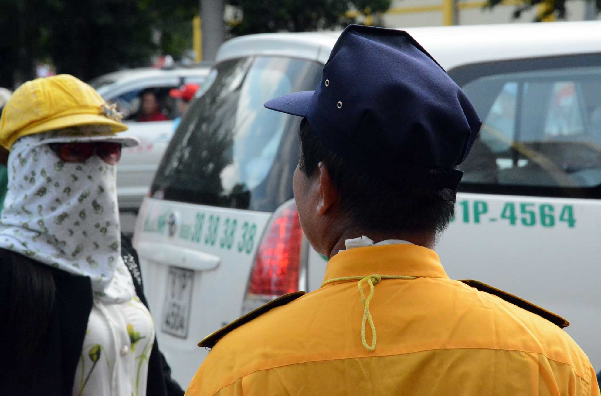 | Đứng giữa trời nắng nóng, đông nghịt người và xe cộ, mỗi nhân viên bảo vệ phải tự tìm cách giải nhiệt cho mình. Trong ảnh: Một nhân viên bảo vệ điều tiết giao thông phải dùng khăn lạnh để sau gáy giải nhiệt. |