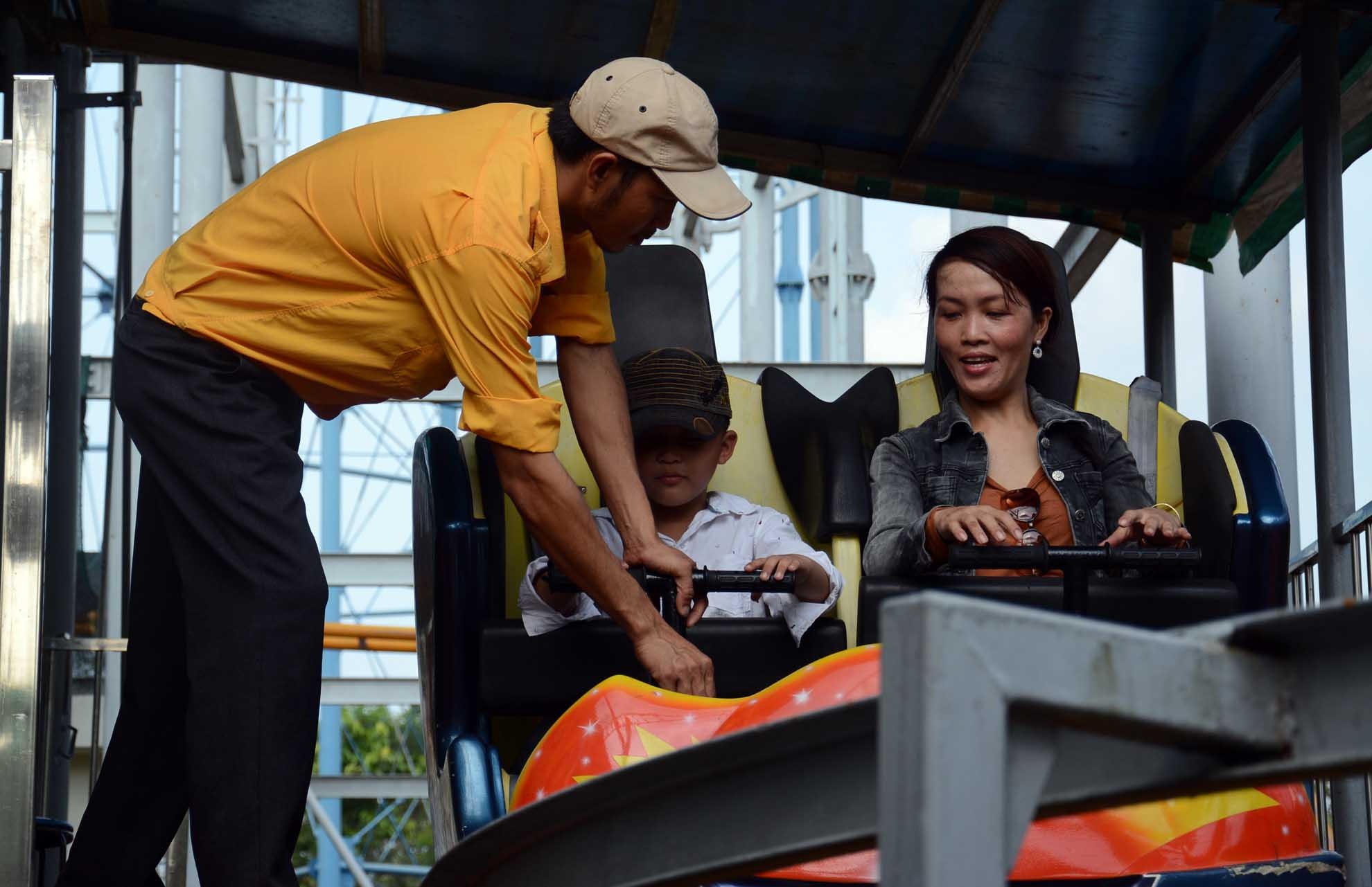 | Nhân viên phục vụ trò chơi liên tục tay chân hướng dẫn và đảm bảo an toàn cho du khách. |