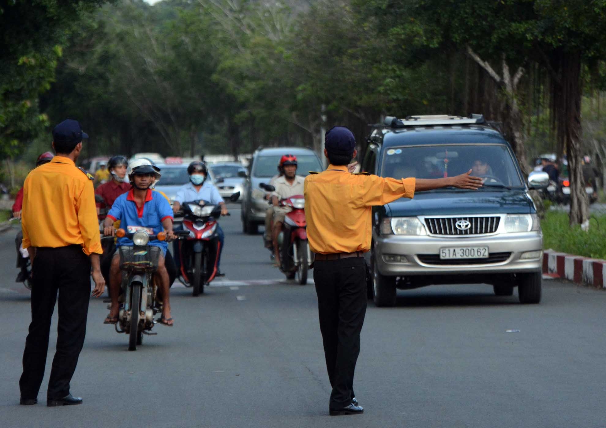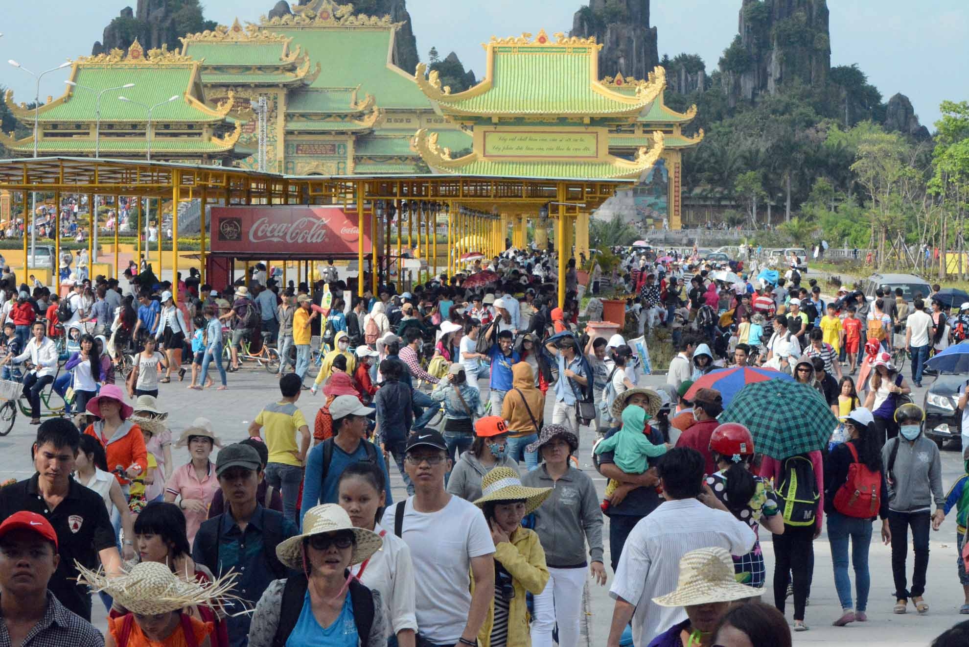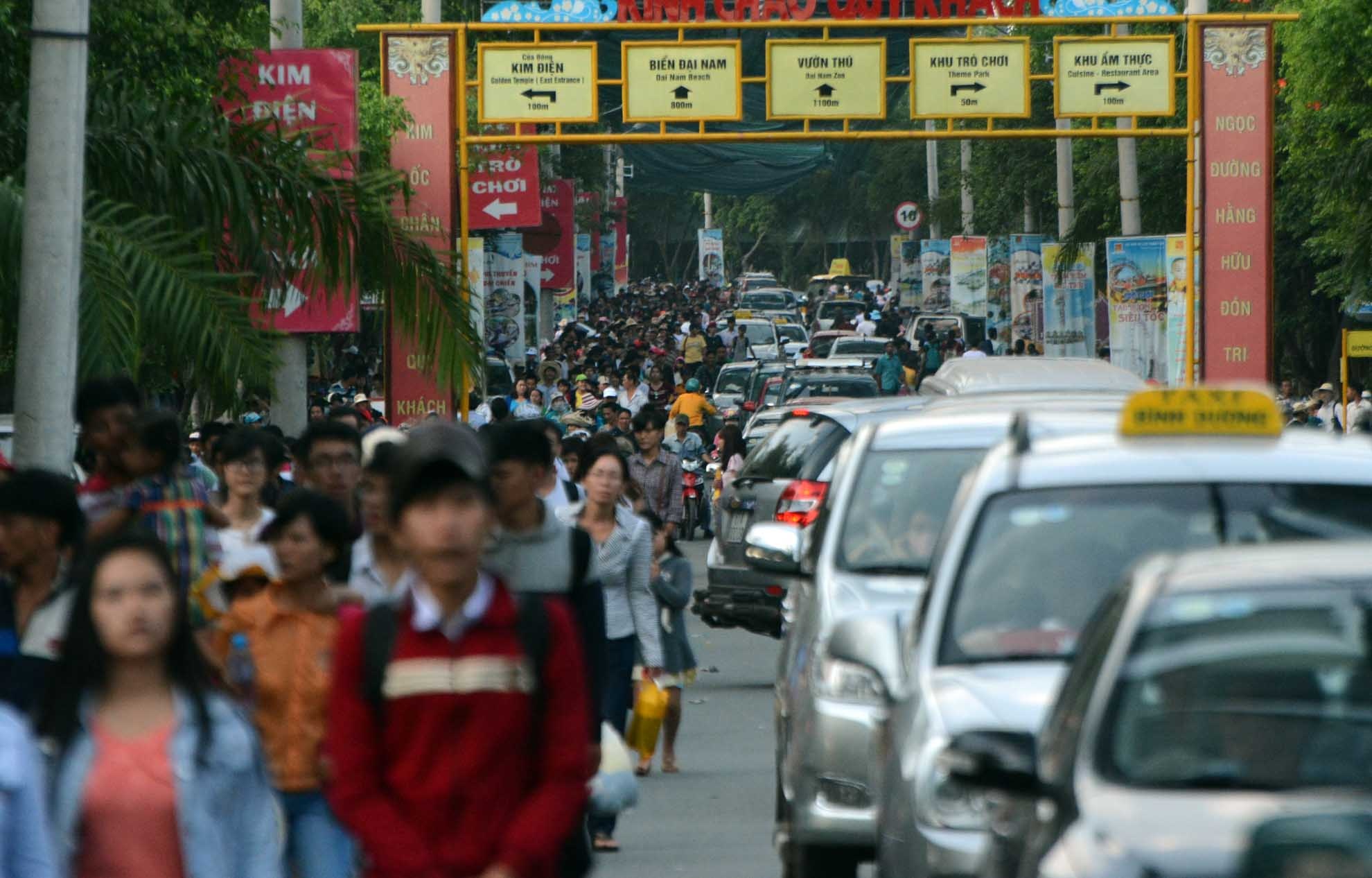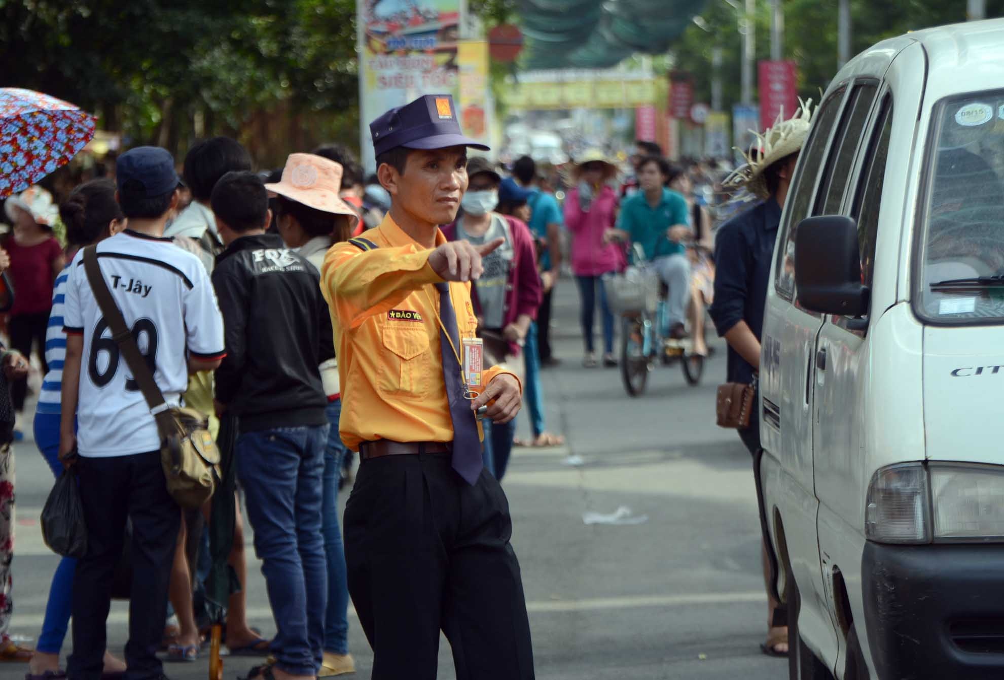 | Những con đường trong và ngoài khu du lịch đông nghịt người đi bộ, xe đạp, xe máy, ô tô qua lại. Tại các ngã đường, có từ 3 đến 5 nhân viên bảo vệ đứng túc trực để điều tiết giao thông. |