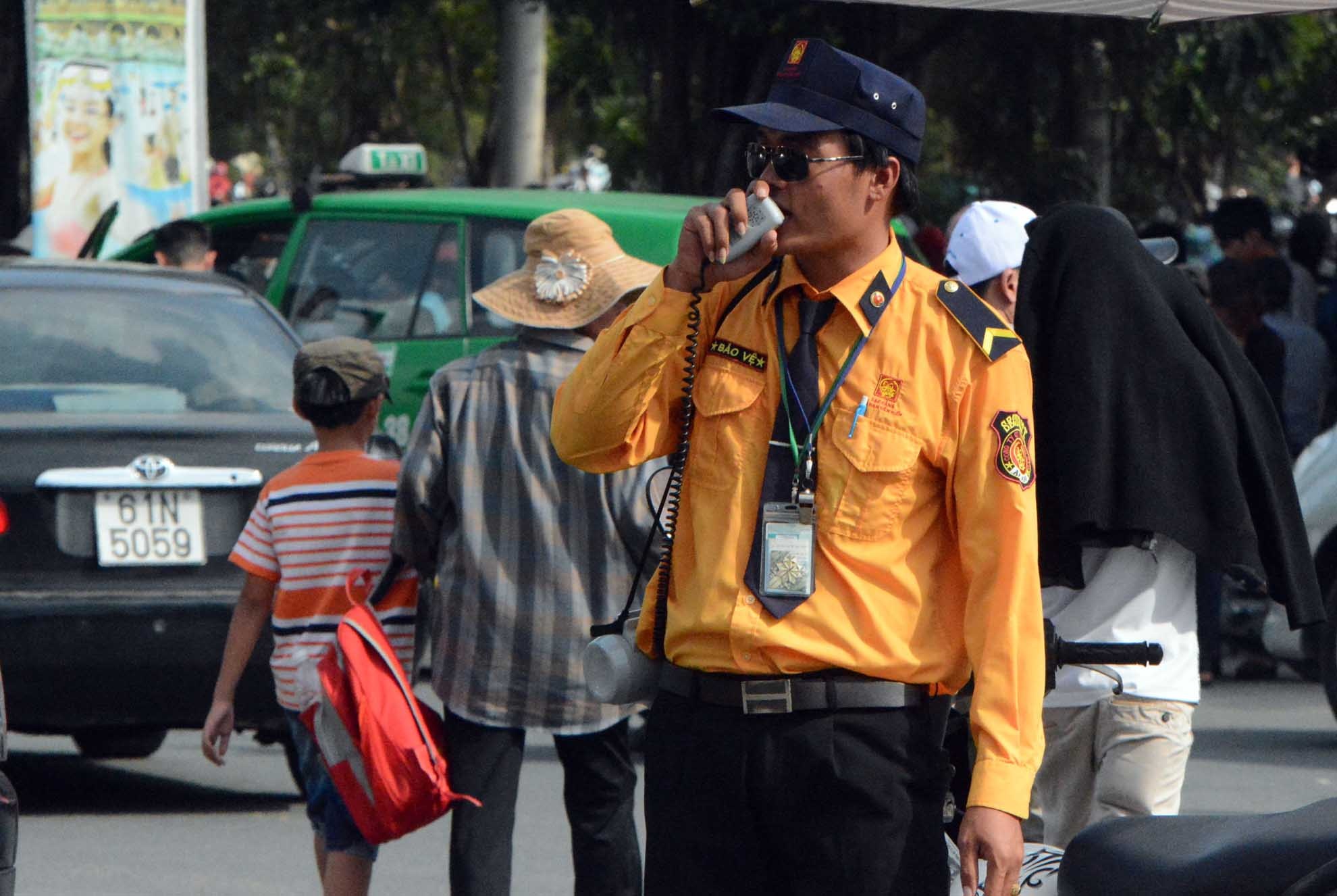 | Bảo vệ phải dùng loa hướng dẫn, điều tiết xe cộ đi lại tới các khu vực trong và ngoài khu du lịch. |
