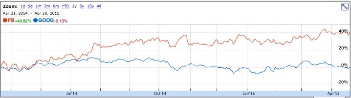 Giá trị thị trường của Facebook (đỏ) và Google từ 21/4/2014 đến 20/4/2015 |
