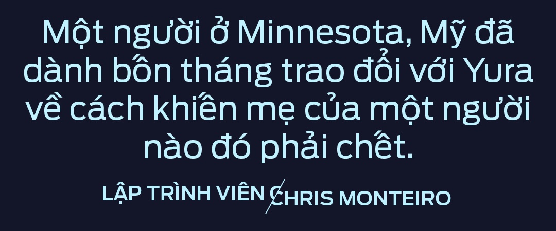 Một người Hà Lan thậm chí trả 20 Bitcoin để mục tiêu bị kết liễu và hiện trường dàn dựng như tai nạn giao thông. "Một người ở Minnesota, Mỹ dành 4 tháng trao đổi với Yura về cách khiến mẹ đối thủ phải chết", Monteiro cho biết.