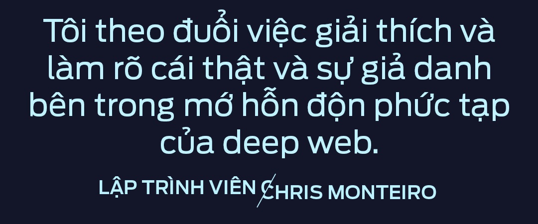 "Tôi theo đuổi việc giải thích, làm rõ cái thật lẫn sự giả danh bên trong mớ hỗn độn phức tạp của deep web. Đó là mục tiêu tối thượng của riêng tôi”, Chris Monteno nói.
