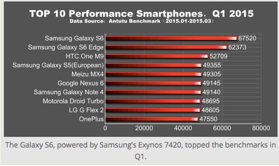 Theo bảng xếp hạng của Q1, Galaxy S6 trang bị vi xử lý Exynos 7420 của Samsung hiện đang đứng đầu bảng xếp hạng benchmark. Tuy nhiên, hạn chế của Exynos là được thiết kế riêng cho các sản phẩm điện thoại Samsung nên chỉ một số ít các nhà sản xuất mới có thể sử dụng chip xử lý này. Một ví dụ có thể kể tới là Meizu, hiện đang có tin đồn về việc dòng điện thoại mới nhất MX5 Pro của Meizu sẽ được trang bị chip tối tân Exynos 7420 của Samsung. Để khắc phục hạn chế này, Samsung đang từng bước xây dựng một danh mục các vi xử lý hiện đại có thể tiếp cận với nhiều nhà sản xuất di động đến từ các phân khúc khác nhau, từ dòng thấp cấp sử dụng vi xử lý bốn nhân 3470 cho đến các sản phẩm cao cấp hơn, được trang bị vi xử lý 6 nhân, 8 nhân thế hệ 5 và đương nhiên là không thể thiếu vắng vi xử lý Exynos thế hệ 7.