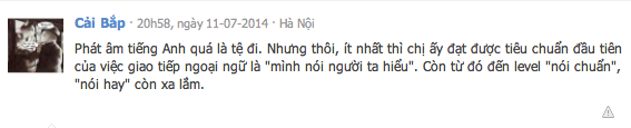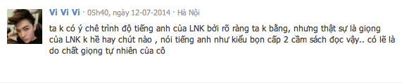 Một khán giả có nickname Hoàng Lâm nhận xét: "Nghe qua cứ tưởng tiếng Khmer, nghe kỹ hoá ra tiếng... Lào. Không thể tin được, ngữ âm tiếng Anh của cô ấy quá kém".
