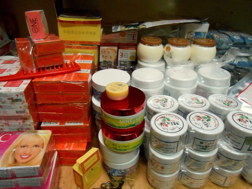 Trên thị trường hiện nay, giá một số loại kem trộn làm trắng, dưỡng ẩm, tẩy tế bào chết đều khá “mềm”. Ngoài giới thiệu là hàng tự trộn bằng nguyên liệu ngoại nhập (thường là Thái Lan), người bán còn bảo hành cả về uy tín, chất lượng. Một hũ kem trộn 100 gr được cho là dưỡng trắng cực nhanh có giá 85.000 đồng. Loại dưỡng ẩm 70.000 đồng/hũ, tẩy tế bào chết 80.000 đồng. Trong ảnh: Kem trộn được bán tại một cửa hàng trong ngách nhỏ trên phố Nguyễn Chí Thanh (quận Đống Đa, Hà Nội).