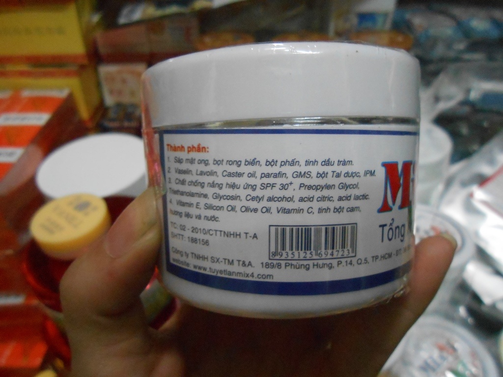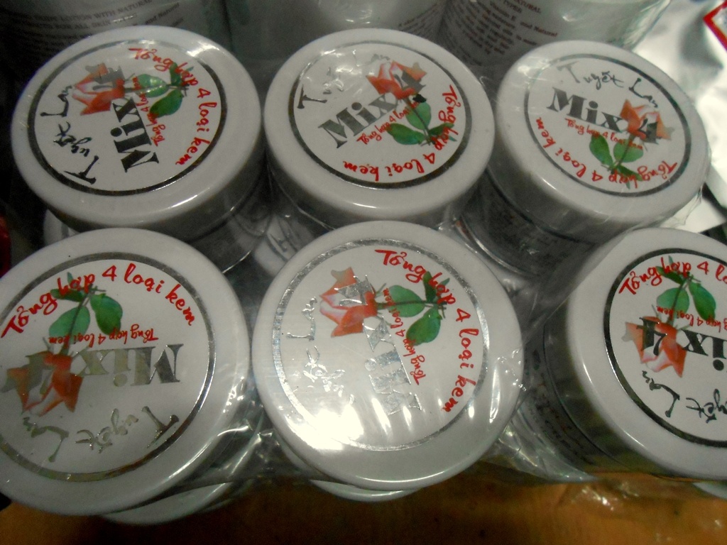 | Có những loại kem trộn được người bán quảng cáo là “kem cốt Thái Lan” - nguyên liệu làm ra kem trộn cao cấp. Người bán cũng quảng cáo loại hàng này có đủ tác dụng như dưỡng trắng siêu tốc, xóa bỏ vết thâm nám, chống lão hóa, trị mụn, chống nắng. |