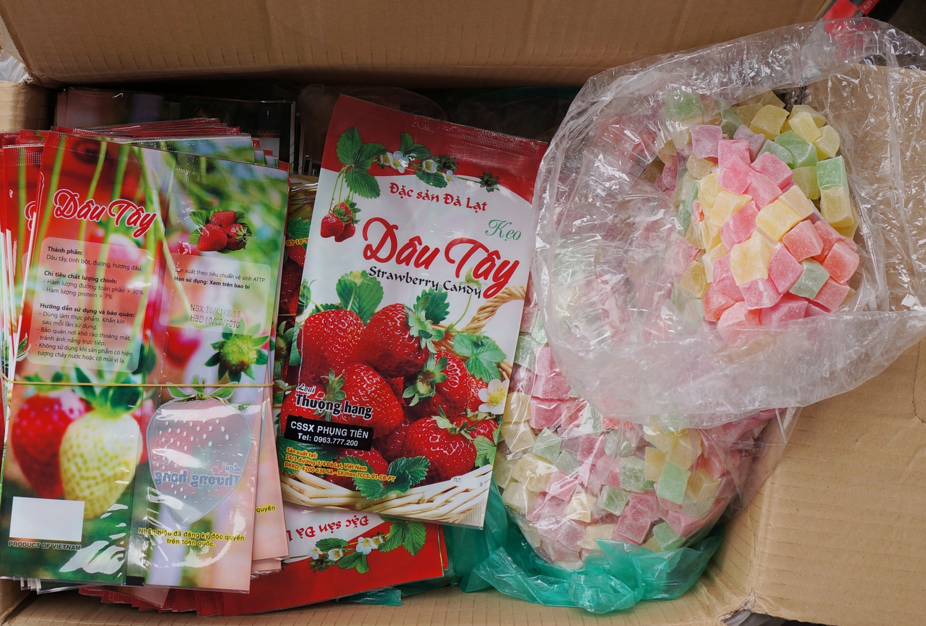 Kẹo dẻo "3 không" (không hạn sử dụng, không nguồn gốc, không kiểm định chất lượng) cũng được đóng kèm hàng trăm tem nhãn tiếng Việt, quảng cáo là "đặc sản Đà Lạt".