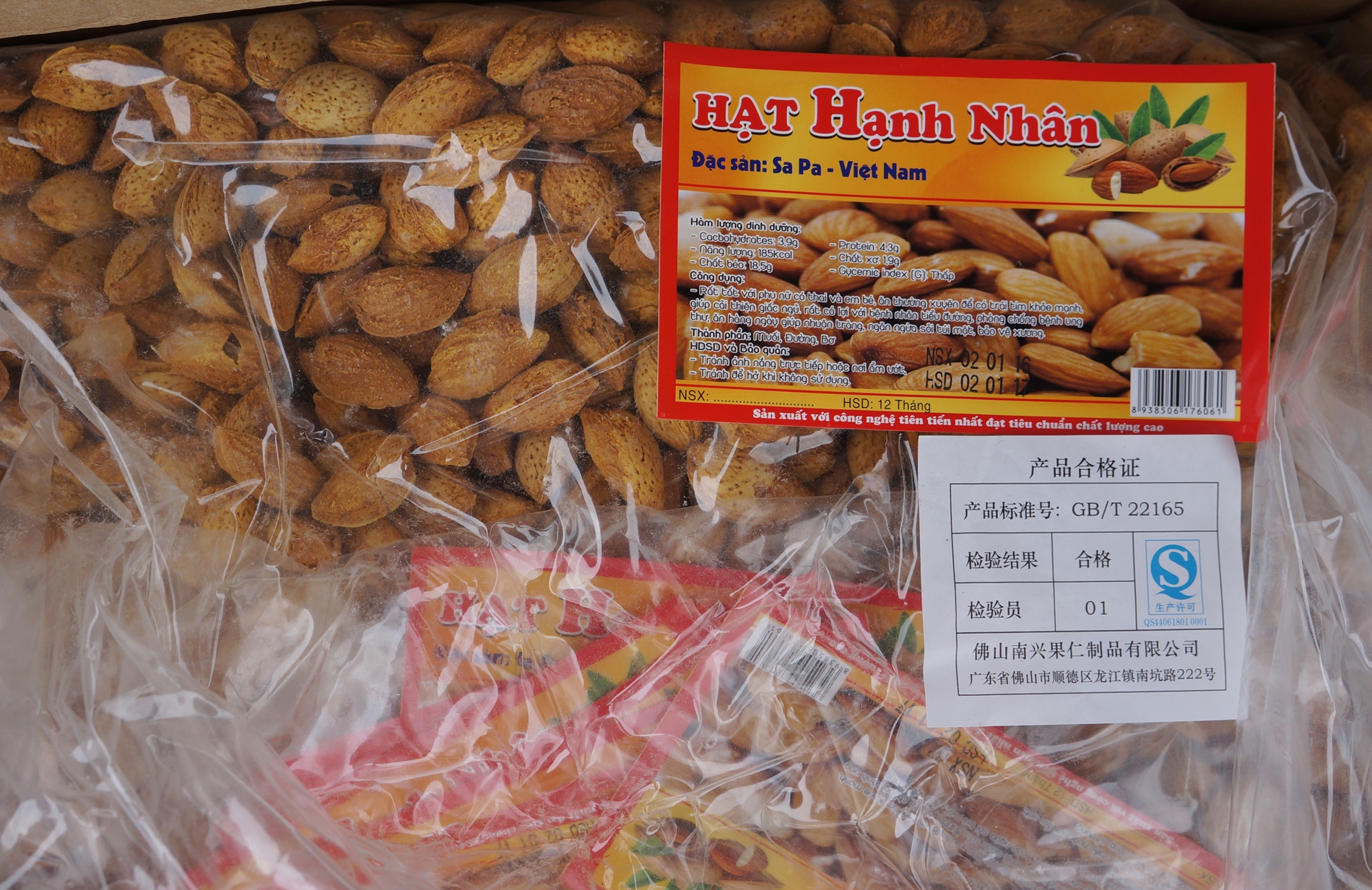 Mở các thùng hạt hạnh nhân, kẹo dẻo có bao bì in chữ Trung Quốc, lực lượng chức năng phát hiện hàng trăm tem nhãn tiếng Việt đi kèm, ghi đây là hàng đặc sản ở Sa Pa và Đà Lạt.