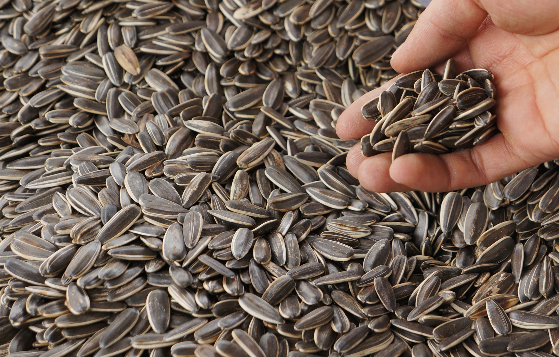 | Cảnh sát kiểm tra một bao hạt bí được đánh dấu là "hàng loại bóng". Theo quan sát, hạt bí có màu vàng khác thường, giống được nhuộm bằng hóa chất.