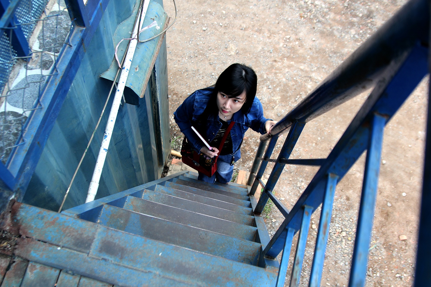 Cầu thang lên gác lửng được thiết kế độc lập bên ngoài để tiết kiệm không gian. Chủ quán cho biết, do không có nhiều diện tích và việc xây dựng khó khăn nên anh quyết định mua một thùng container cũ thiết kế lại thành quán. Quá trình thiết kế, thi công cũng tương đối đơn giản, chỉ cần bố trí thêm cửa, ốp tường cách nhiệt, trang bị máy lạnh là hoàn thiện. Đầu tư quán như thế này giúp anh tiết kiệm được 50% chi phí so với quán bình thường.