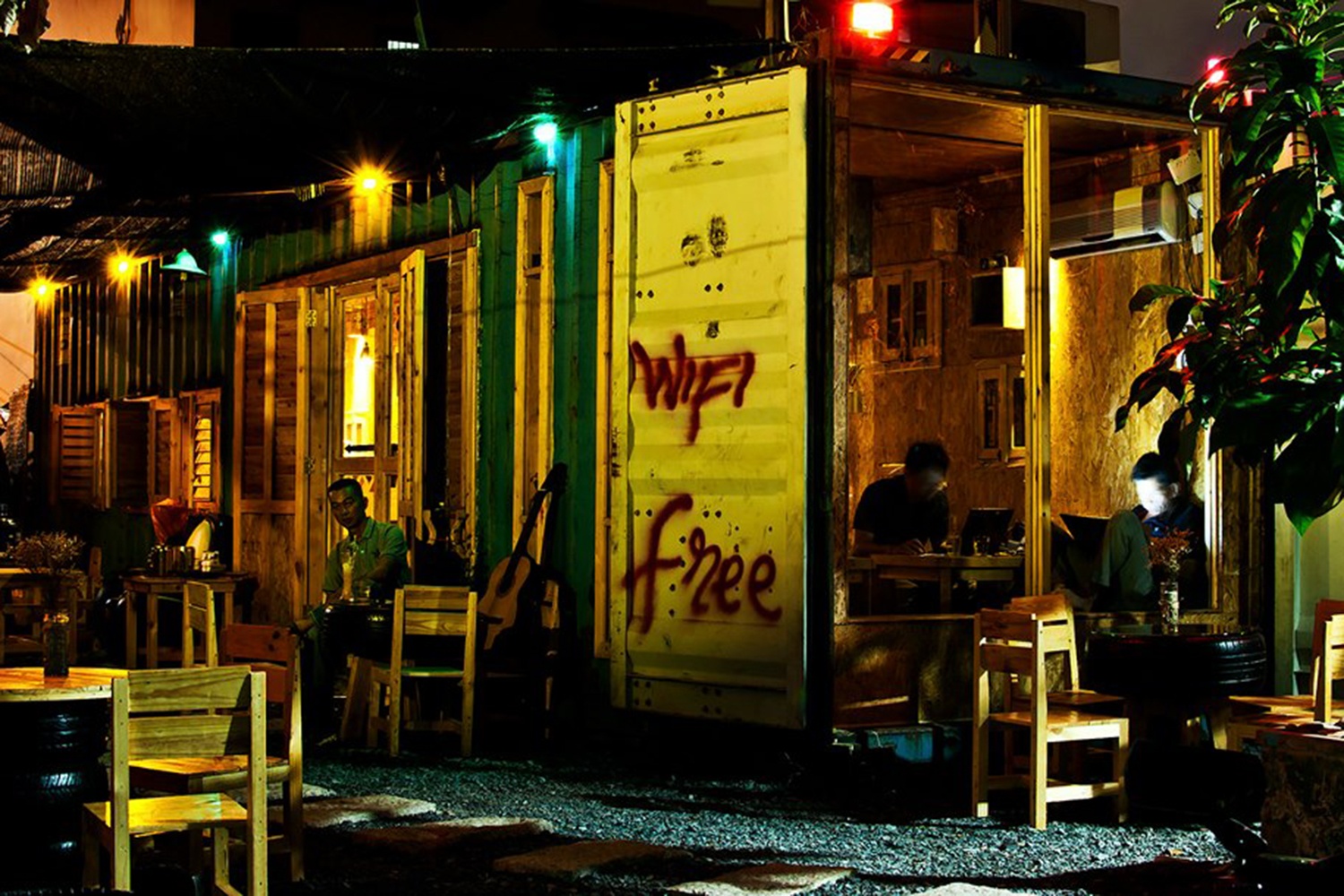 | Về đêm, những container này trở nên lung linh dưới hệ thống ánh sáng được thiết kế đặc biệt. "Thông thường những quán cà phê thuê đất, thuê nhà, nếu muốn chuyển đi nơi khác sẽ rất khó khăn. Nhưng với mô hình quán cà phê container thì việc di chuyển sẽ cực kỳ đơn giản", anh Giang nói. |