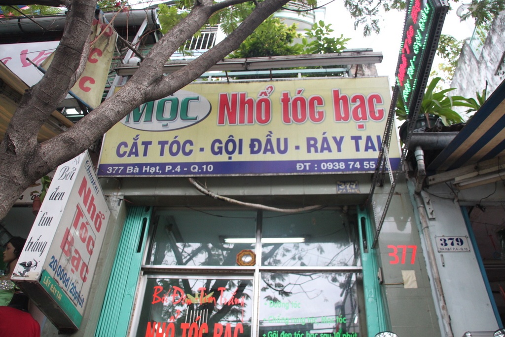 | Là nơi đầu tiên ở Sài Gòn có dịch vụ này, quán Mộc (Q.10) trở thành điểm đến quen thuộc của nhiều người bị tóc bạc, trong đó chủ yếu là nam ở độ tuổi trung niên. Giá cho mỗi giờ nhổ tóc bạc là 80.000 đồng. Theo chủ quán, khách đến 1 - 2 lần/tuần và trải qua 1 - 2 giờ cho nhân viên mân mê mái đầu để "bới đen tìm trắng". |