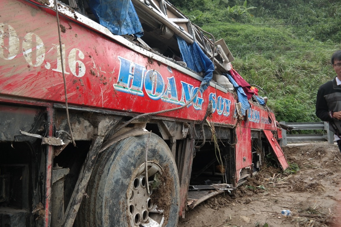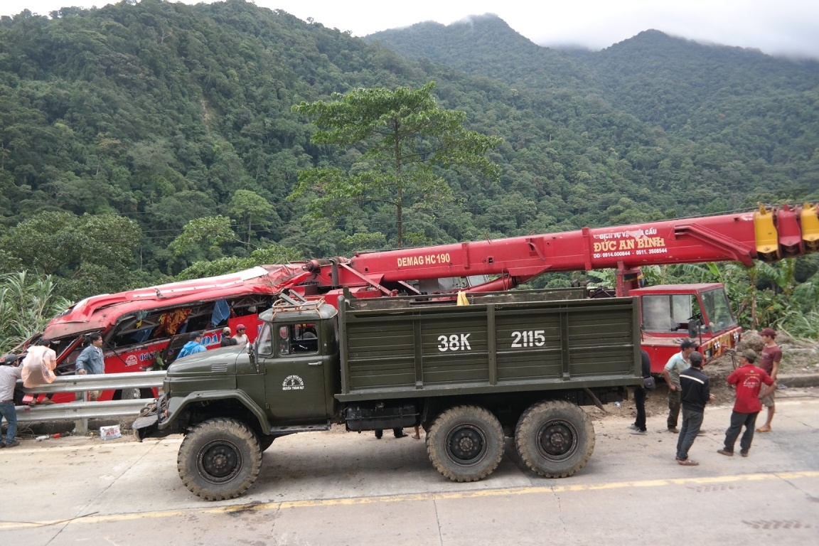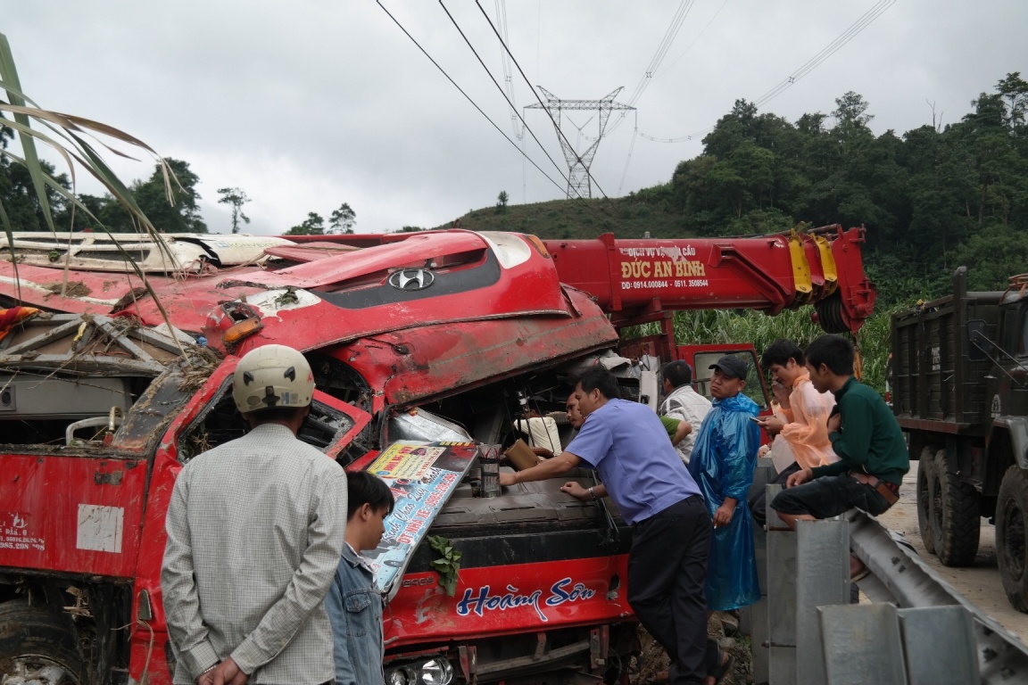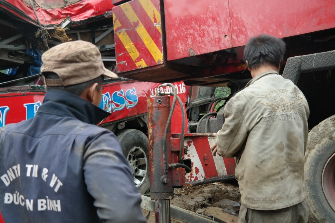 Sau hơn 20 giờ cứu hộ, các lực lượng chức năng đã kéo được ôtô khách giường nằm từ vực sâu hơn 100 m lên đường. Chiếc xe này bị hư hỏng nặng, nhiều bộ phận nát bét.