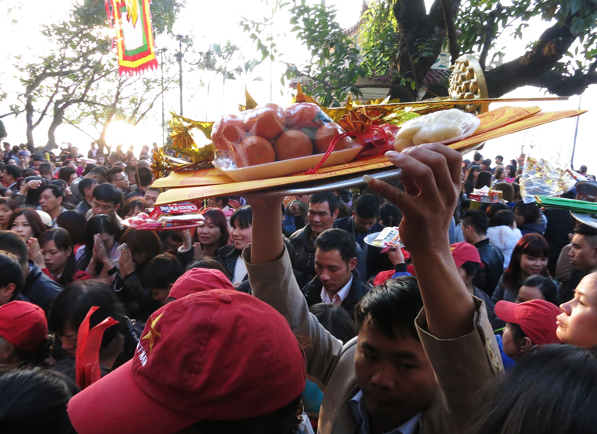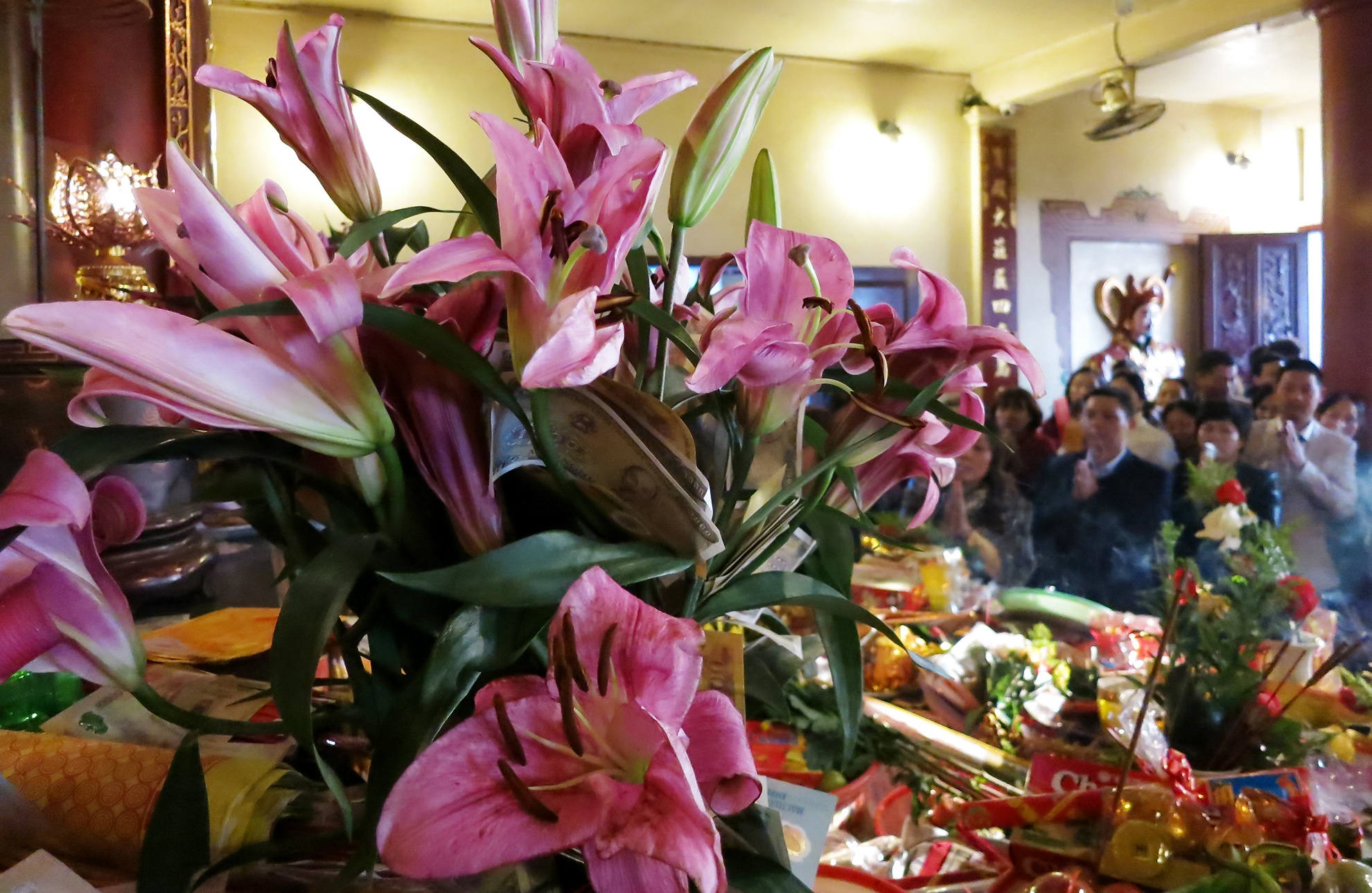 Nhiều người tìm cách đặt đồ lễ vào nơi thờ cúng không được vì đã hết chỗ. |