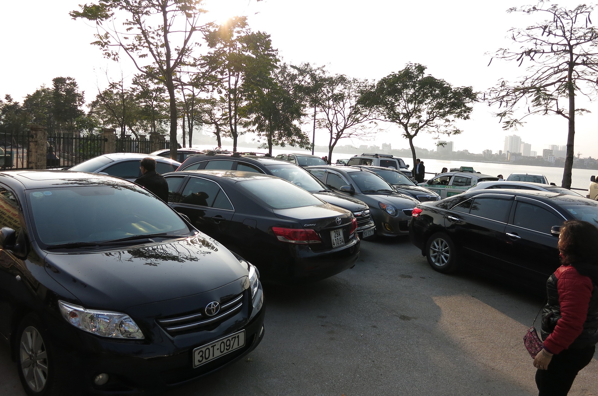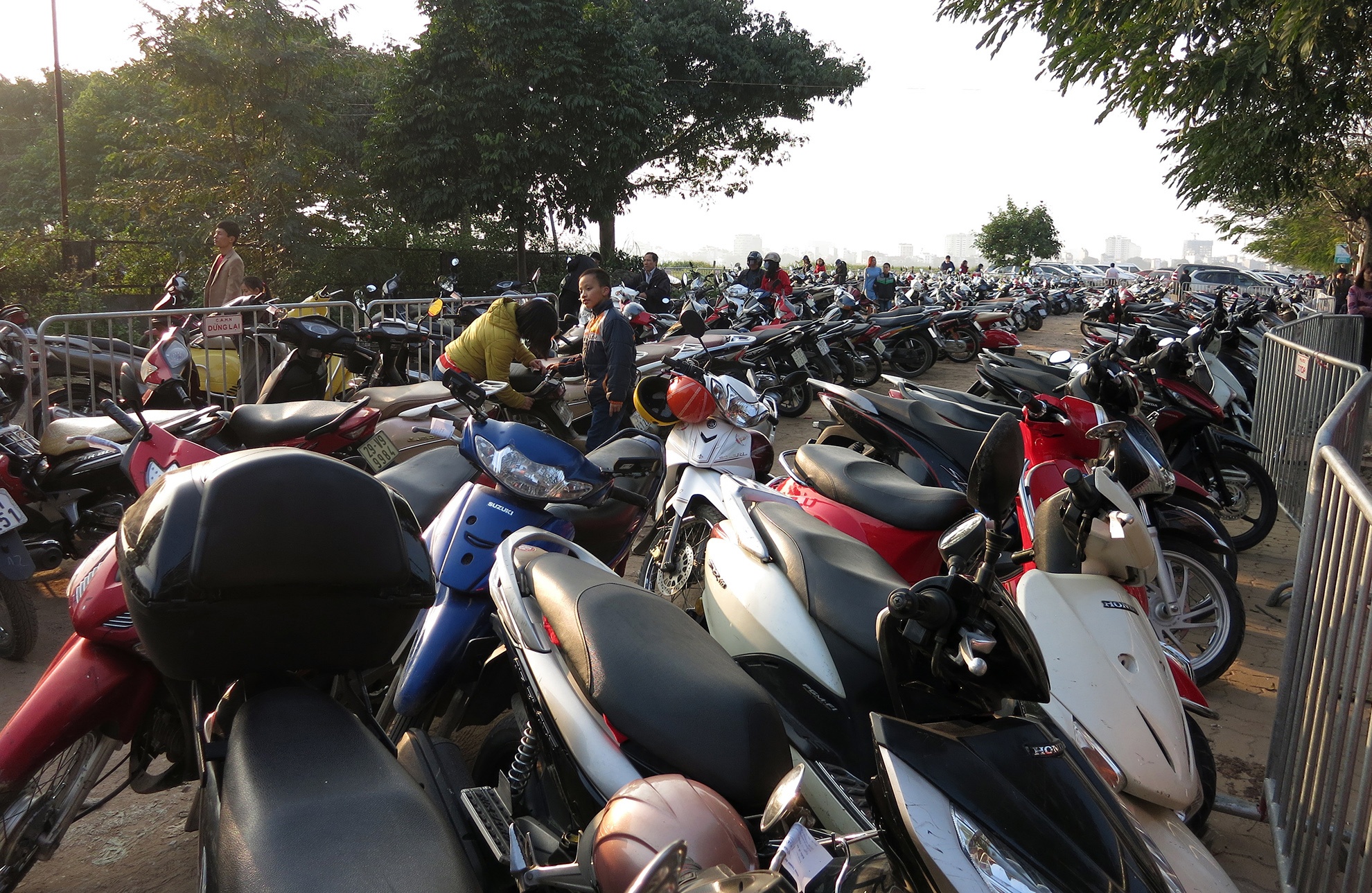 | Bãi đỗ xe dài khuất tầm mắt tại khu đất trống cạnh phủ Tây Hồ. May mắn, giá gửi xe máy không tăng giá, chỉ 5.000 đồng/lượt. Riêng ôtô không mất phí, nhưng chỉ trông đến 21h đêm. |