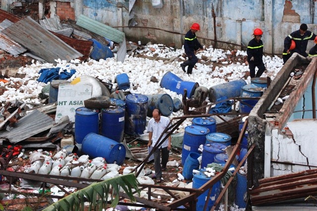 | Hiện trường vụ nổ kinh hoàng tại kho hóa chất của công ty Đặng Huỳnh ở quận 12. Ảnh: T.N |