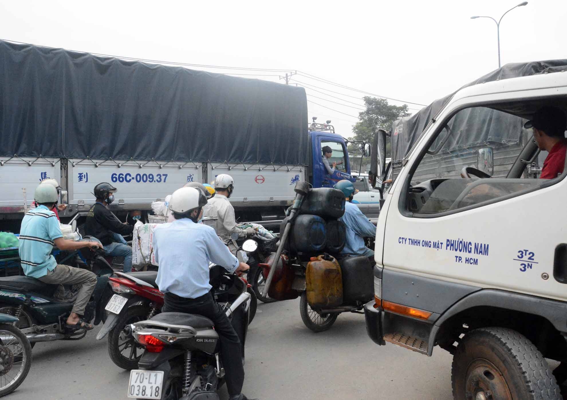 | Tại các ngã tư, thì mạnh ai nấy chạy nên giao thông càng hỗn loạn. CSGT huy động lực lượng điều tiết giao thông tại ngã tư Gò Mây và giao lộ Phan Văn Hớn - quốc lộ 1A. |