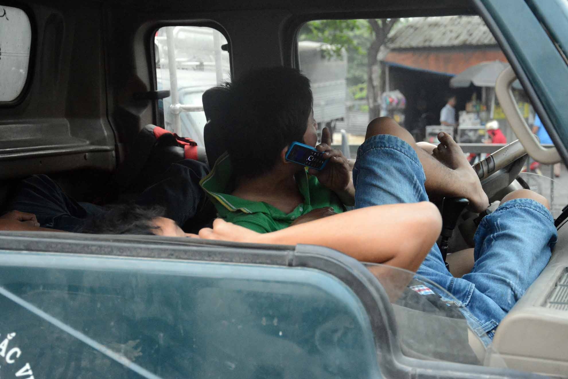 | Nhiều tài xế ôtô trong lúc chờ hết kẹt xe rời cabin theo dõi dòng xe phía trước. Số khác tranh thủ nằm, gục vào vô lăng ngủ, hoặc nói chuyện điện thoại. |