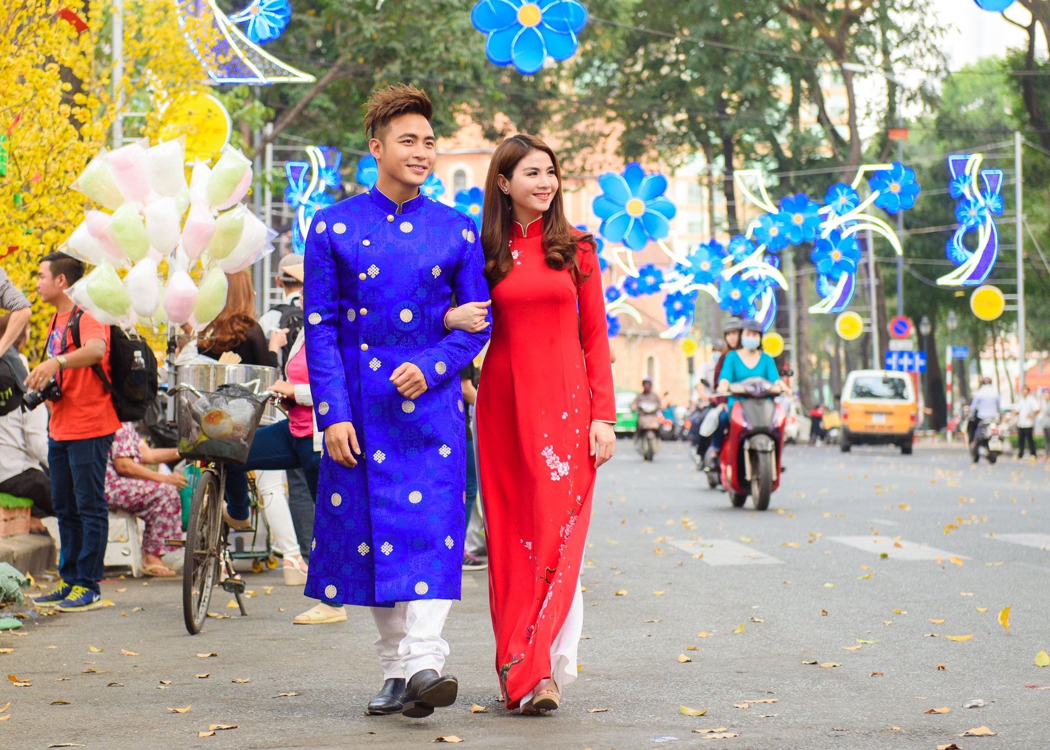 Cặp đôi diện áo dài rực rỡ của nhà thiết kế Thuận Ngọc hòa trong không khí năm mới rộn ràng trên các con đường tại trung tâm TP HCM.