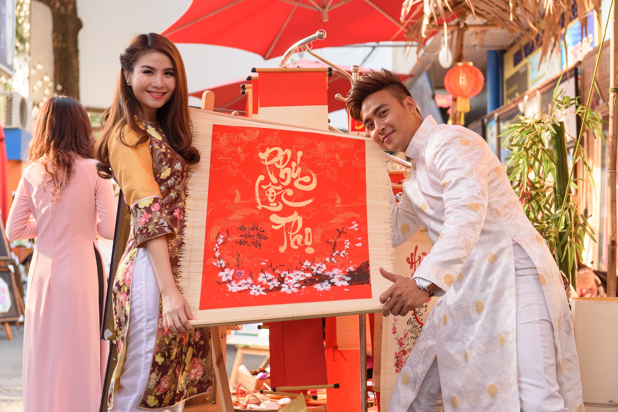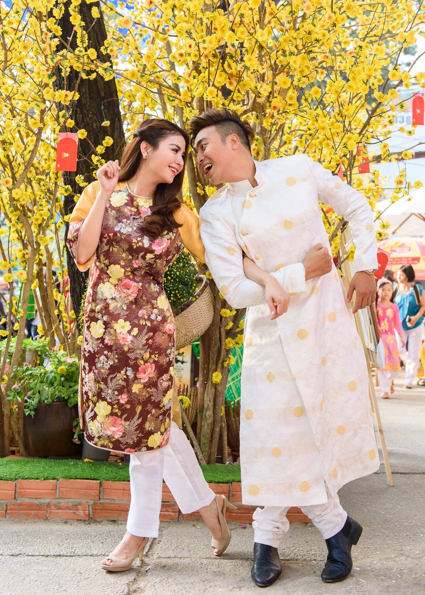 Cặp đôi diễn viên của sân khấu Hồng Vân diện áo dài, tay trong tay hạnh phúc xuống phố xin chữ, ngắm khung cảnh mùa xuân rực rỡ.
