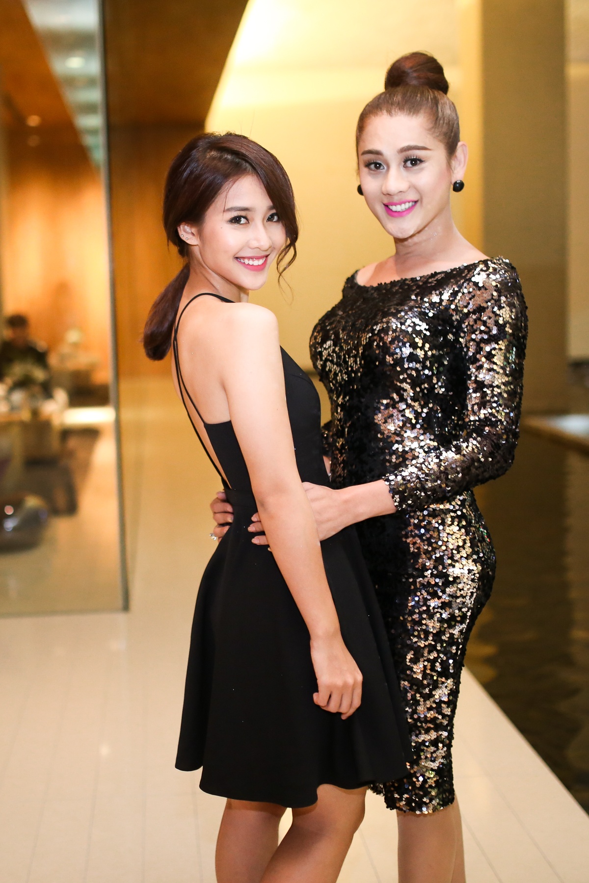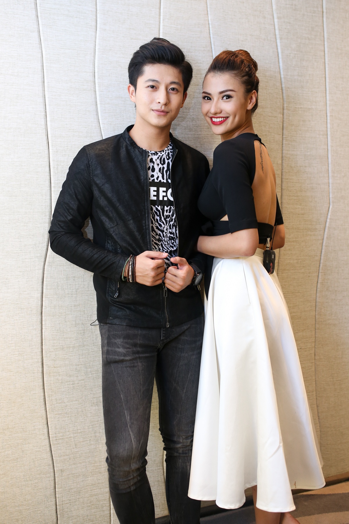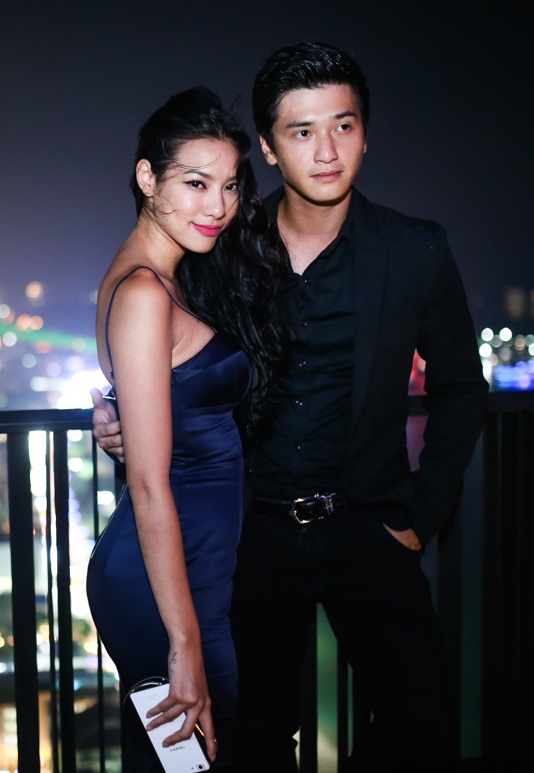| Phương Mai lựa chọn mẫu váy quây, khoe vòng một táo bạo. Cô tạo dáng thân thiết bên "tình tin đồn" Nathan Lee. |