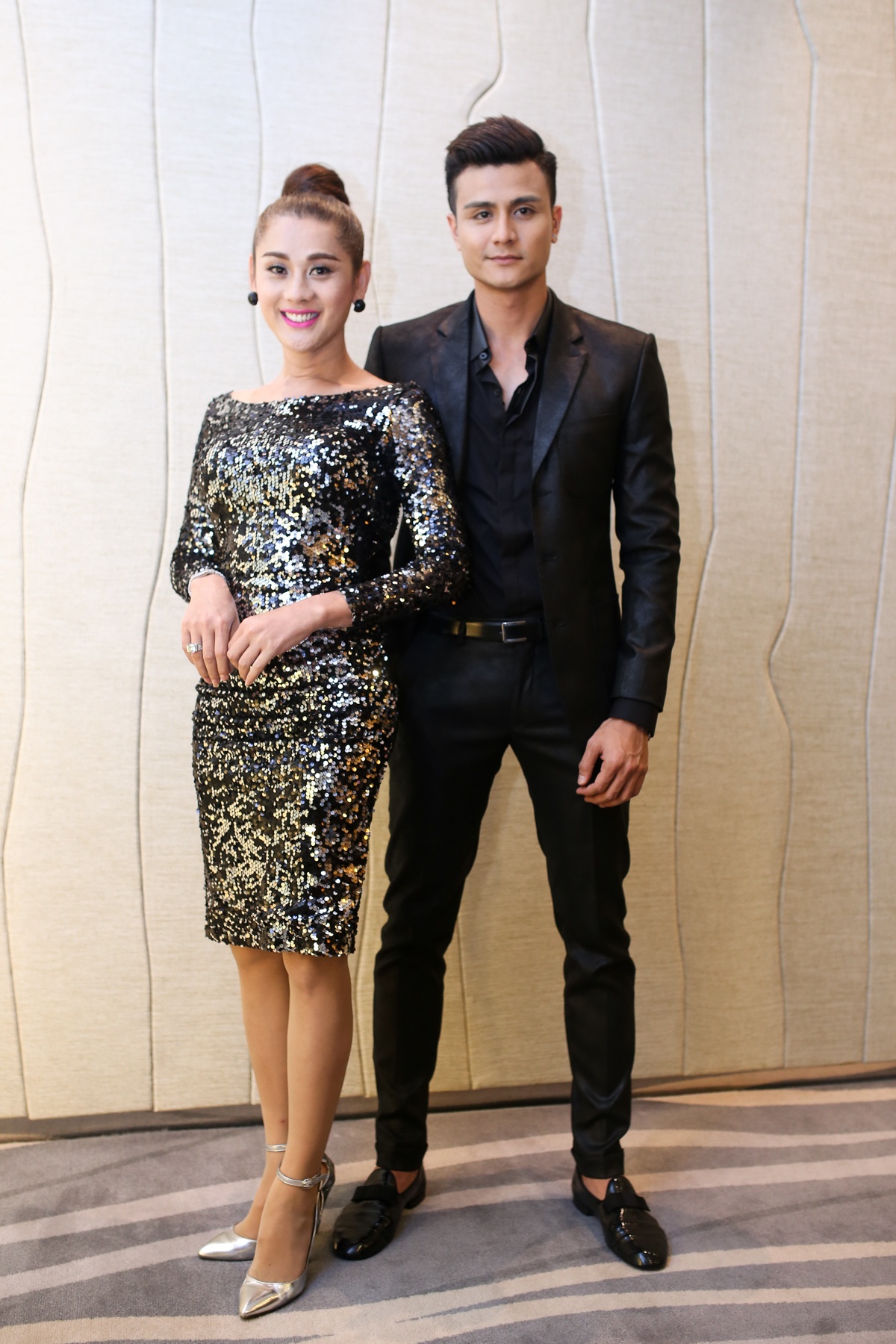 | Vĩnh Thuỵ nam tính với set đồ đen. Anh chụp ảnh cùng thí sinh chuyển giới Lâm Chi Khanh. |