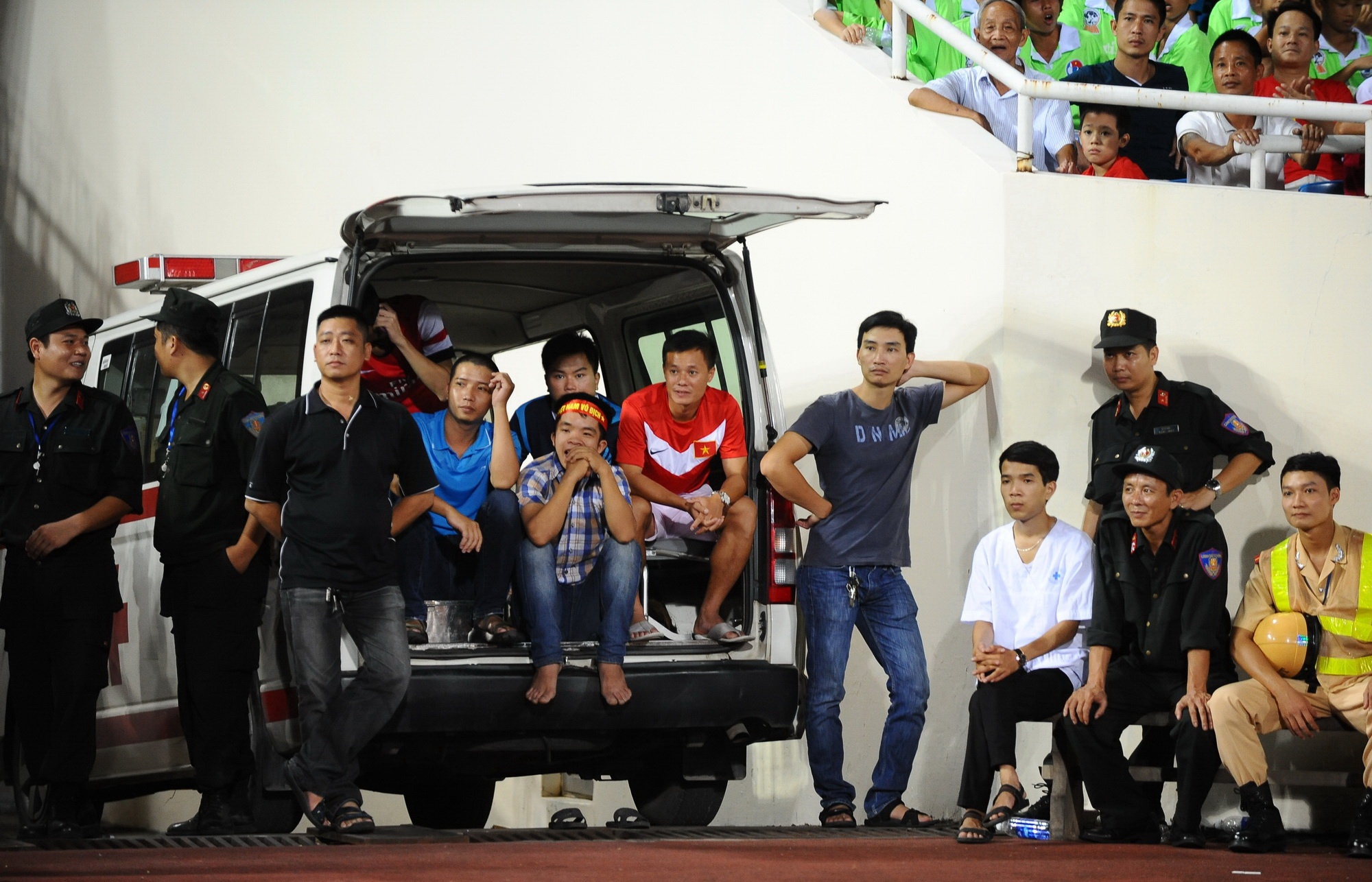 | Tuyển thủ Phạm Thành Lương phải ngồi trên xe cứu thương để theo dõi đàn em U19 Việt Nam thi đấu trận chung kết giải ĐNÁ do không có chỗ ngồi trên khán đài. Cảnh này trái ngược với khán đài còn quá nhiều ghế trống phía sau Thành Lương khi anh khoác áo ĐTQG thi đấu trận giao hữu chuẩn bị cho AFF Cup 2014. |