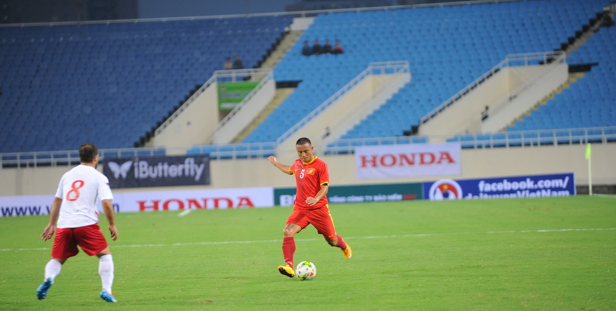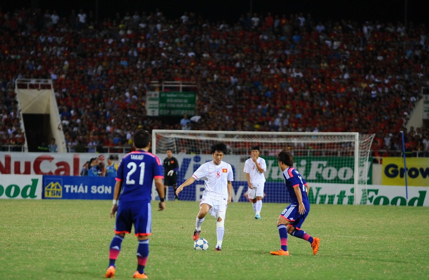 | Tuấn Anh thi đấu dưới sự cổ vũ của 50.000 khán giả, trong khi Tấn Tài và các đồng đội "đơn thương độc mã" trên sân. |