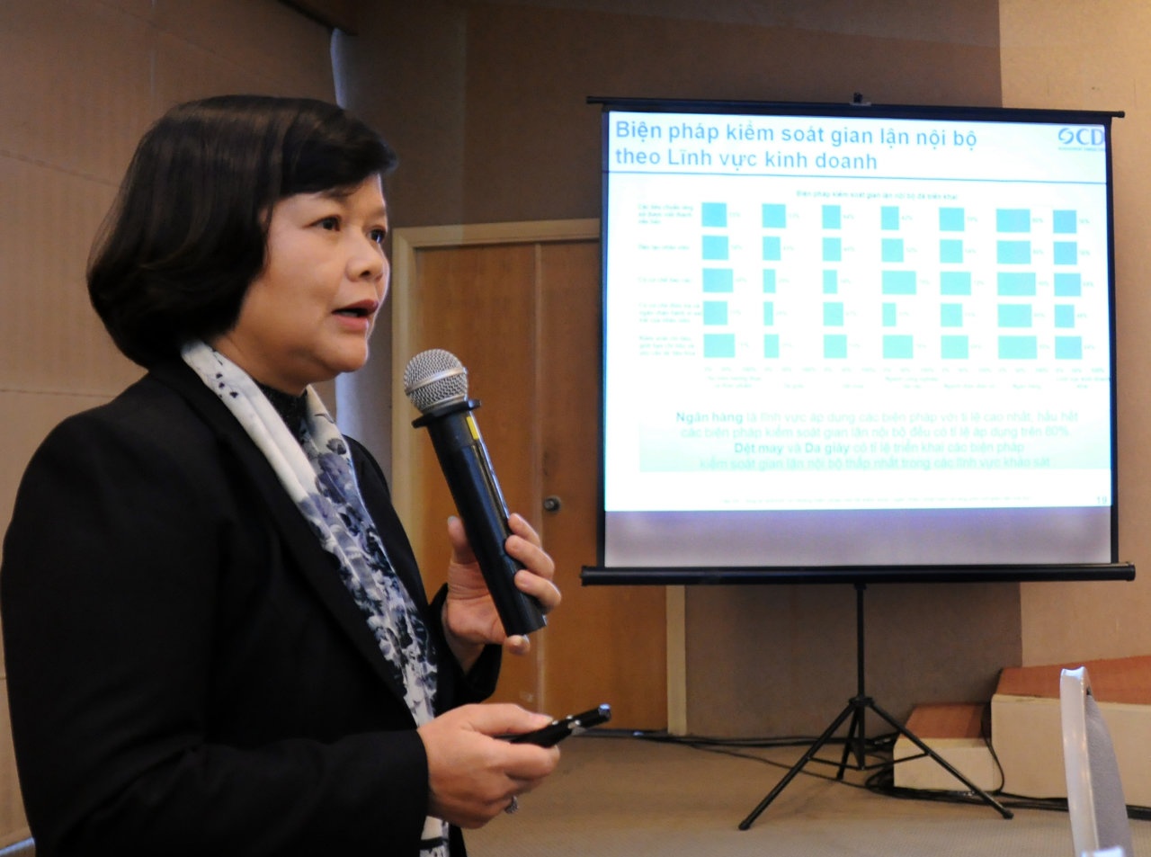 | Bà Trần Thị Kim Thu, chuyên gia thống kê Công ty tư vấn OCD, phát biểu tại buổi công bố kết quả khảo sát hiện trạng thực hành liêm chính trong kinh doanh của doanh nghiệp tại VN - Ảnh: Trần Quốc Tuấn. |