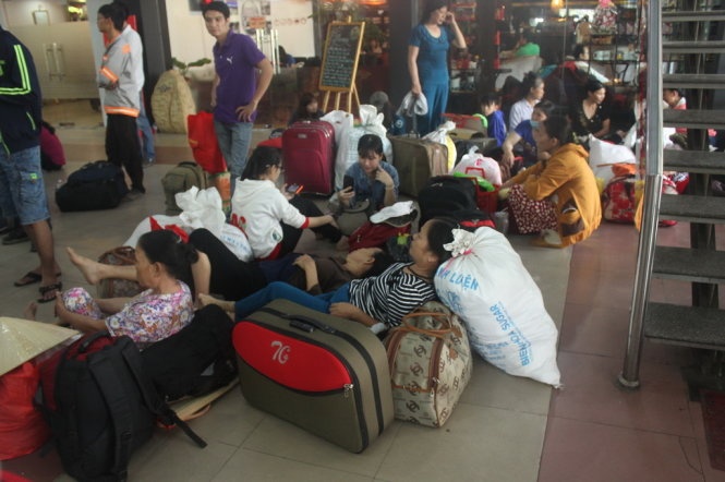 Hành khách nằm ở ga Sài Gòn chờ đi tàu . |