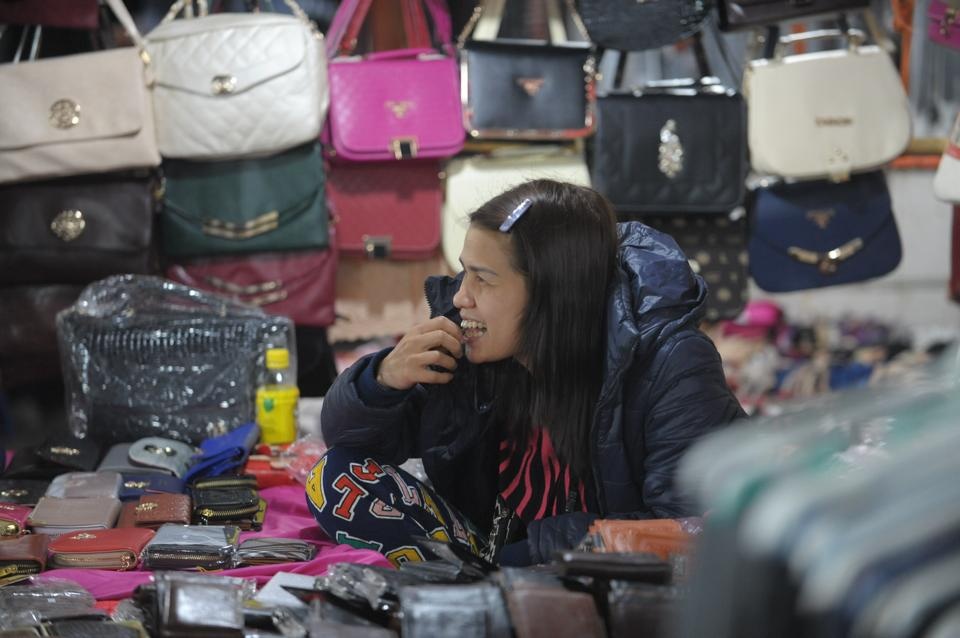 | Tại một gian hàng túi xách nữ, chủ hàng cũng rảnh rỗi ngồi buôn chuyện, tán gẫu vì không có khách ghé mua. Ảnh: Hoàng Anh. |