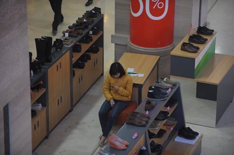 | Tại trung tâm thương mại trên phố Mễ Trì (Nam Từ Liêm, Hà Nội), nhân viên ngồi bấm điện thoại vì không có khách. Ảnh: Hoàng Anh. |