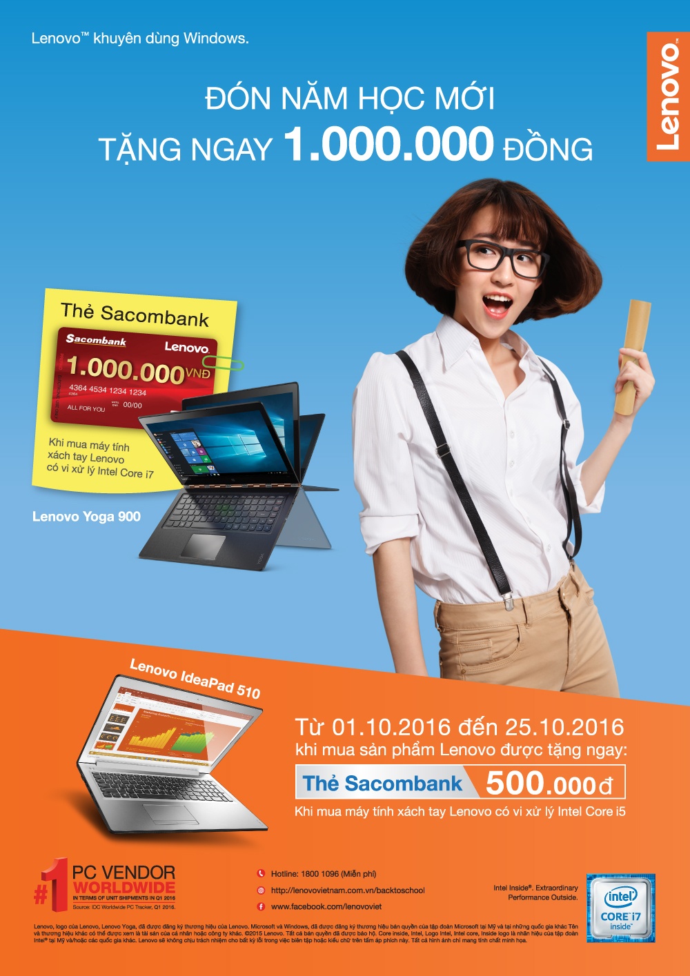 Cụ thể, người mua sẽ được tặng thẻ Sacombank trị giá 1 triệu đồng khi mua máy tính Yoga và IdeaPad dùng chip Intel Core i7 hoặc nhận thẻ Sacombank 500.000 đồng khi mua máy tính Yoga và IdeaPad dùng chip Intel Core i5.