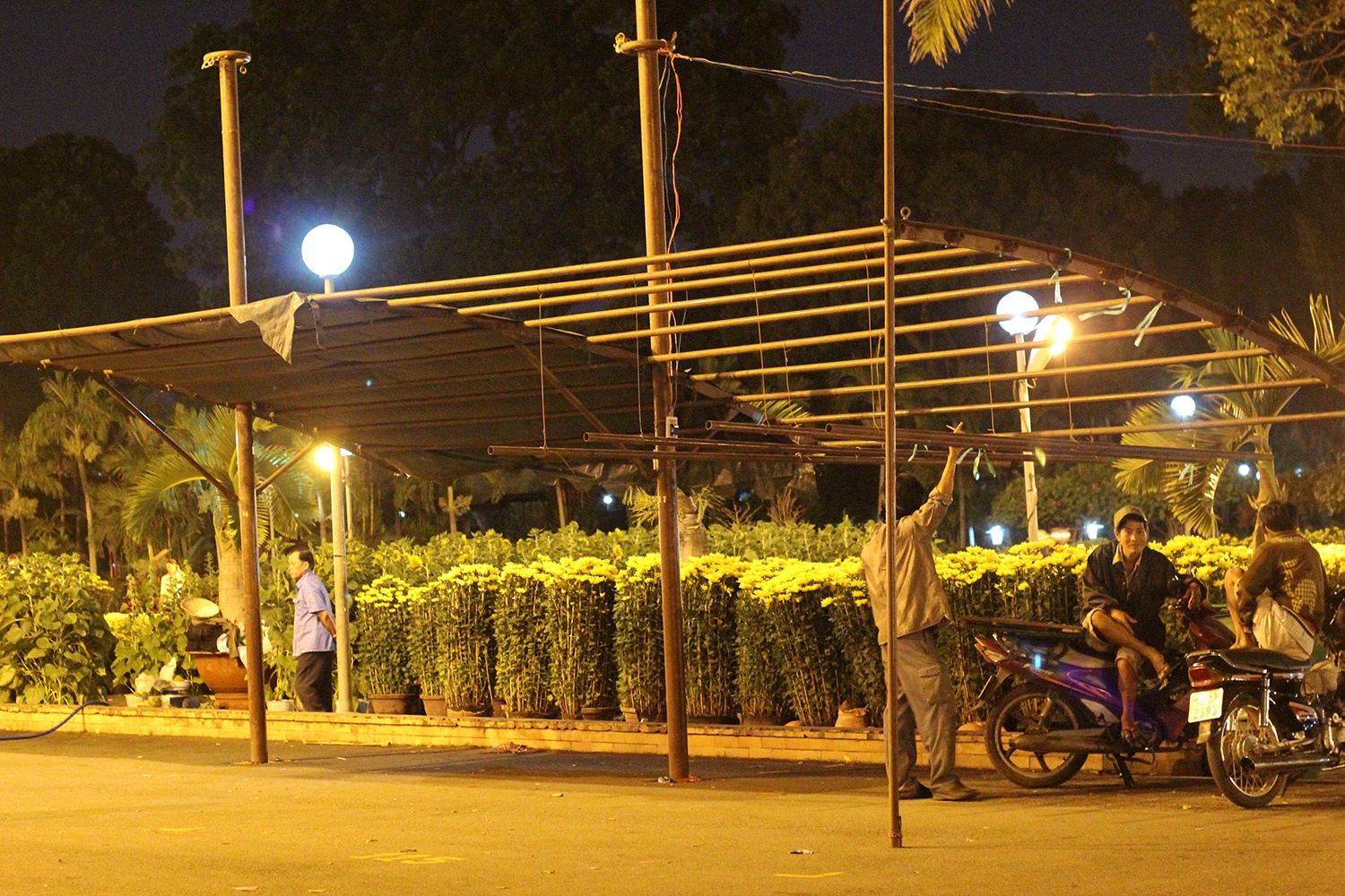 | Thời tiết về đêm khá lạnh khiến nhiều người bán khá vất vả. Chị Quyên, một nhà vườn đến từ Bến Tre cho biết, đêm nay chị sẽ ngủ ở công viên Sài Gòn để giữ hoa. Năm nay nhà chị mang 2.000 chậu hoa cúc mâm xôi lên bán ở chợ hoa TP HCM. Cũng theo chị, năm nay nhà nào cũng tăng gần gấp đôi lượng hoa ra chợ nên giá có thể sẽ giảm hơn năm trước. Hiện một cặp cúc chị bán chỉ có 120.000 đồng, trong khi năm ngoái lên đến 150.000 đồng. |