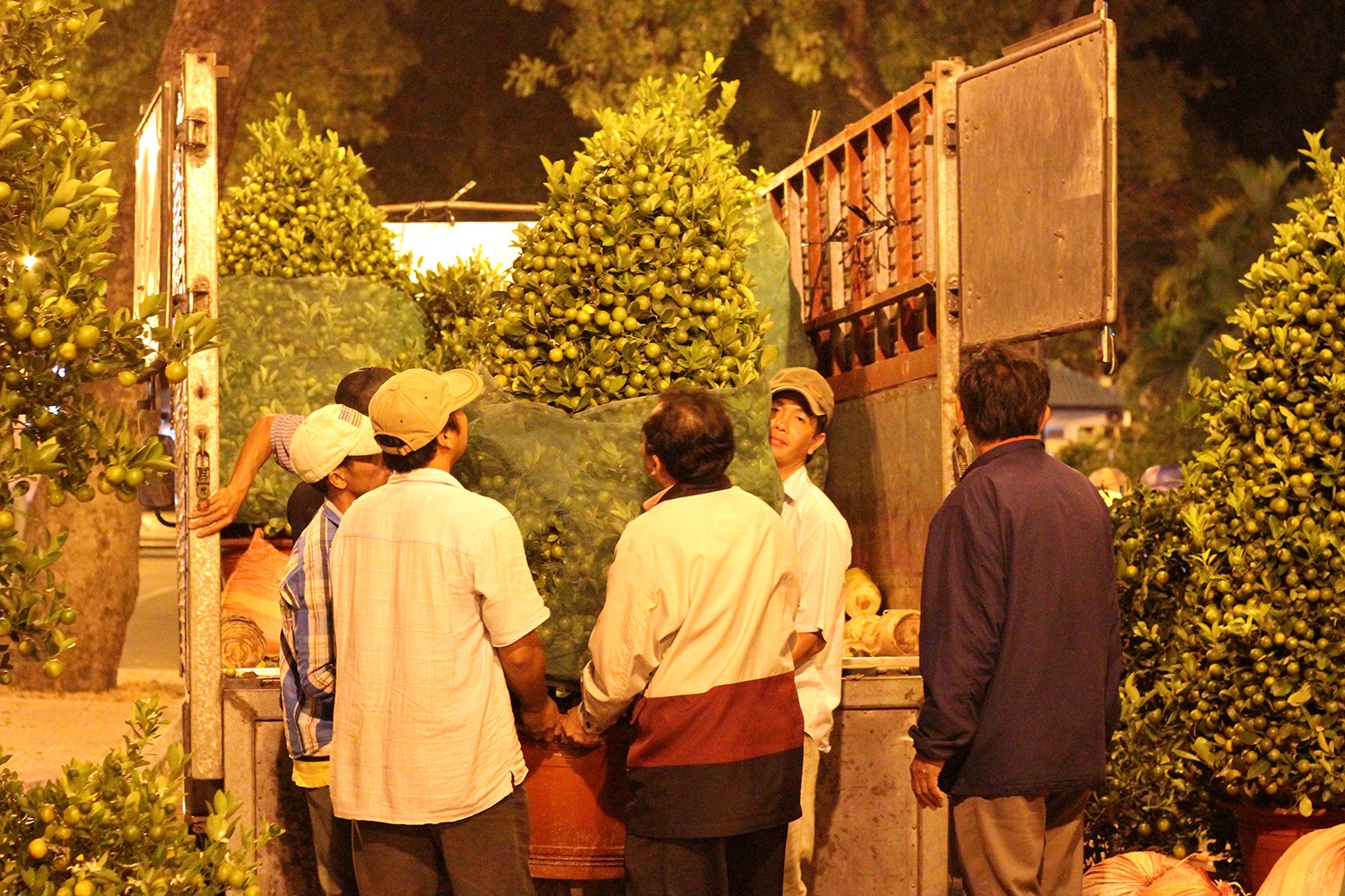 | Những chuyến xe chở quất kiểng liên tục đổ về. Một tài xế cho biết: "Đây là vào mùa cao điểm vận chuyển, nên cả xe lẫn tài đều không phải làm việc liên tục, cứ chất hàng xuống là xe tiếp tục quay đầu để chở tiếp". |