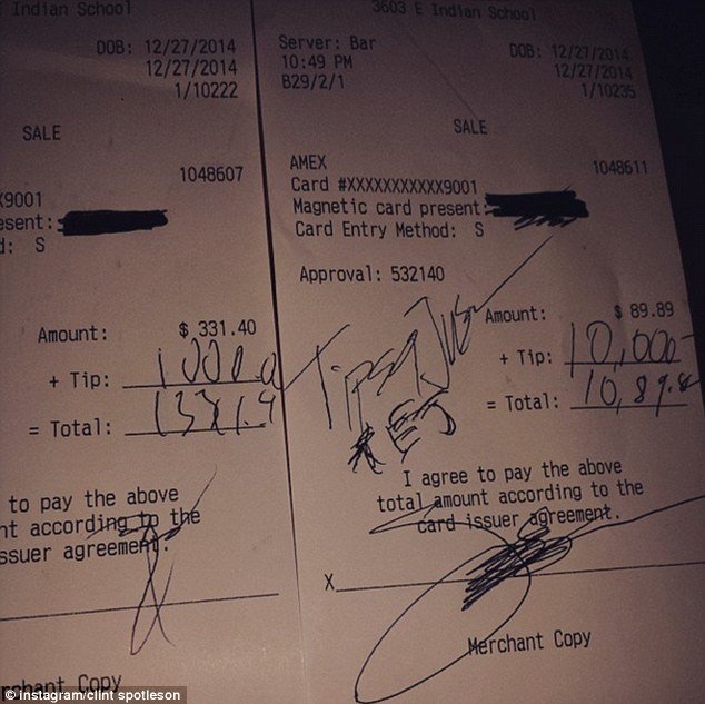 Clint Spotleson, một trong ba người hầu bàn may mắn nhận được số tiền, đã đưa tấm hình hóa đơn trên Instagram.4